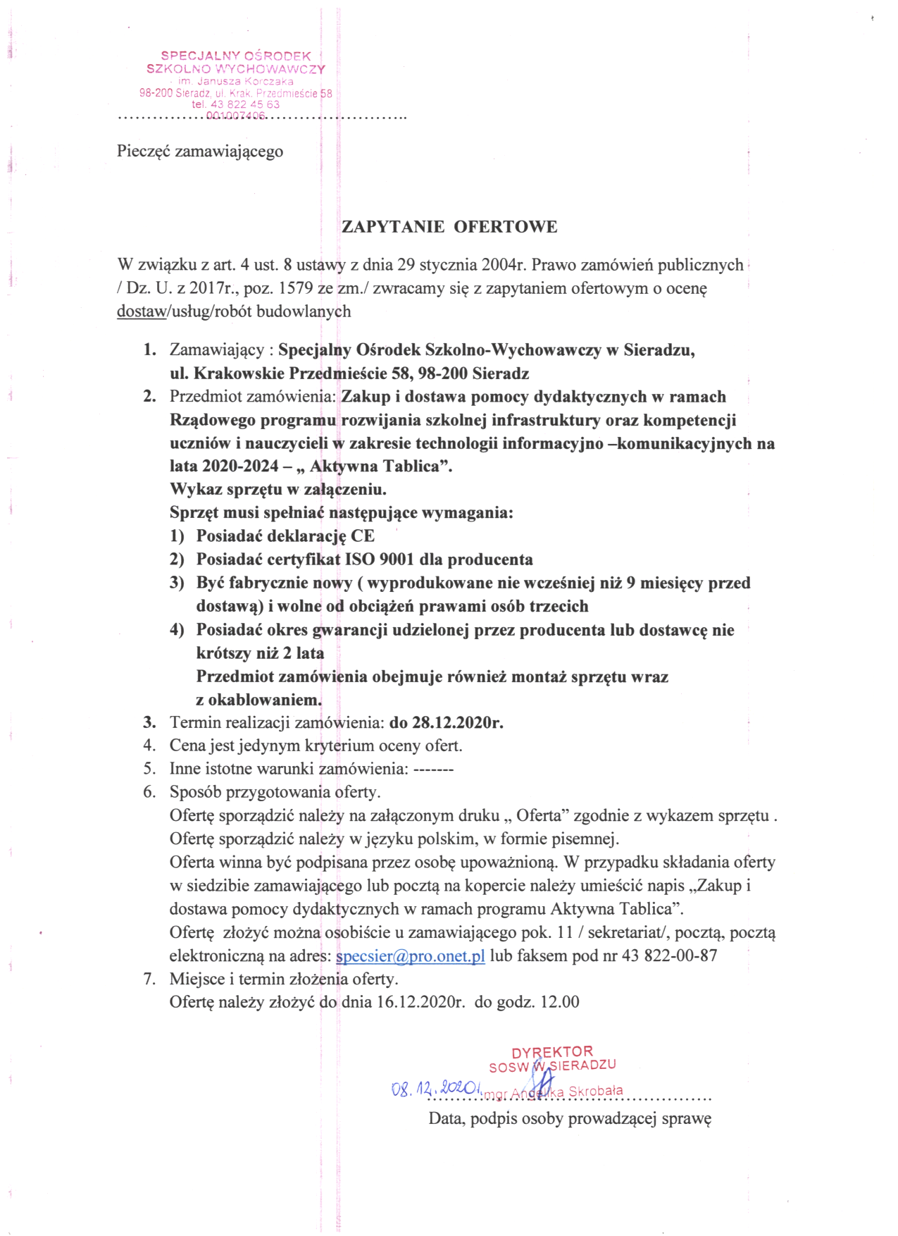 ZAPYTANIE OFEROWE W ZWIĄZKU Z ZAKUPEM I DOSTAWĄ POMOCY DYDAKTYCZNYCH W RAMACH RZĄDOWEGO PROGRAMU ROZWIJANIA SZKOLNEJ INFRASTRUKTURY ORAZ KOMPETENCJI UCZNIÓW I NAUCZYCIELI W ZAKRESIE TECHOLOGII INFORMACYJNO-KOMUNIKACYJNYCH NA LATA 2020-2024 AKTYWNA TABLICA