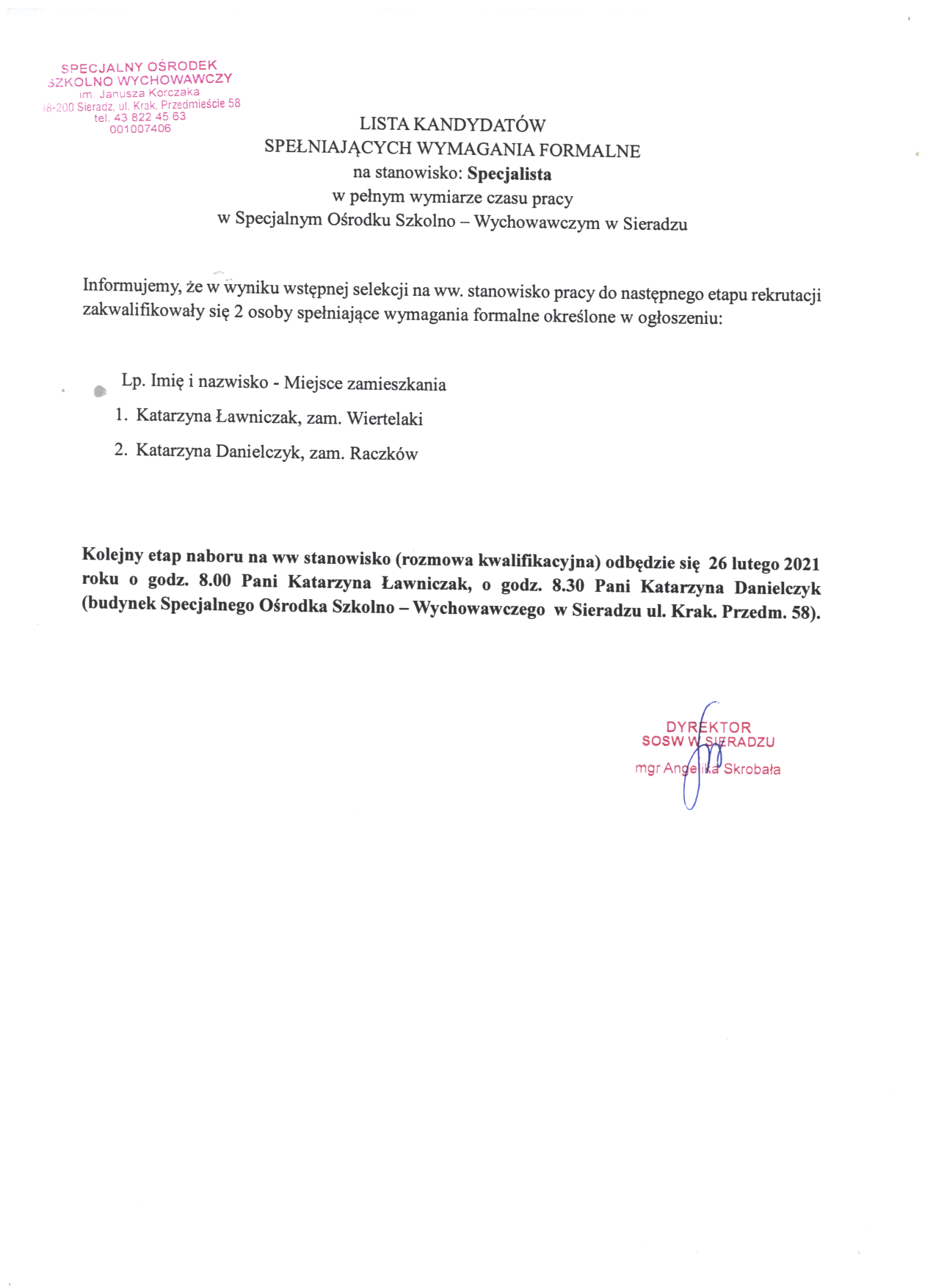 LISTA KANDYDATÓW SPEŁNIAJACYCH WYMAGANIA FORMALNE NA STANOWISKO: SPECJALISTA W SOSW W SIERADZU