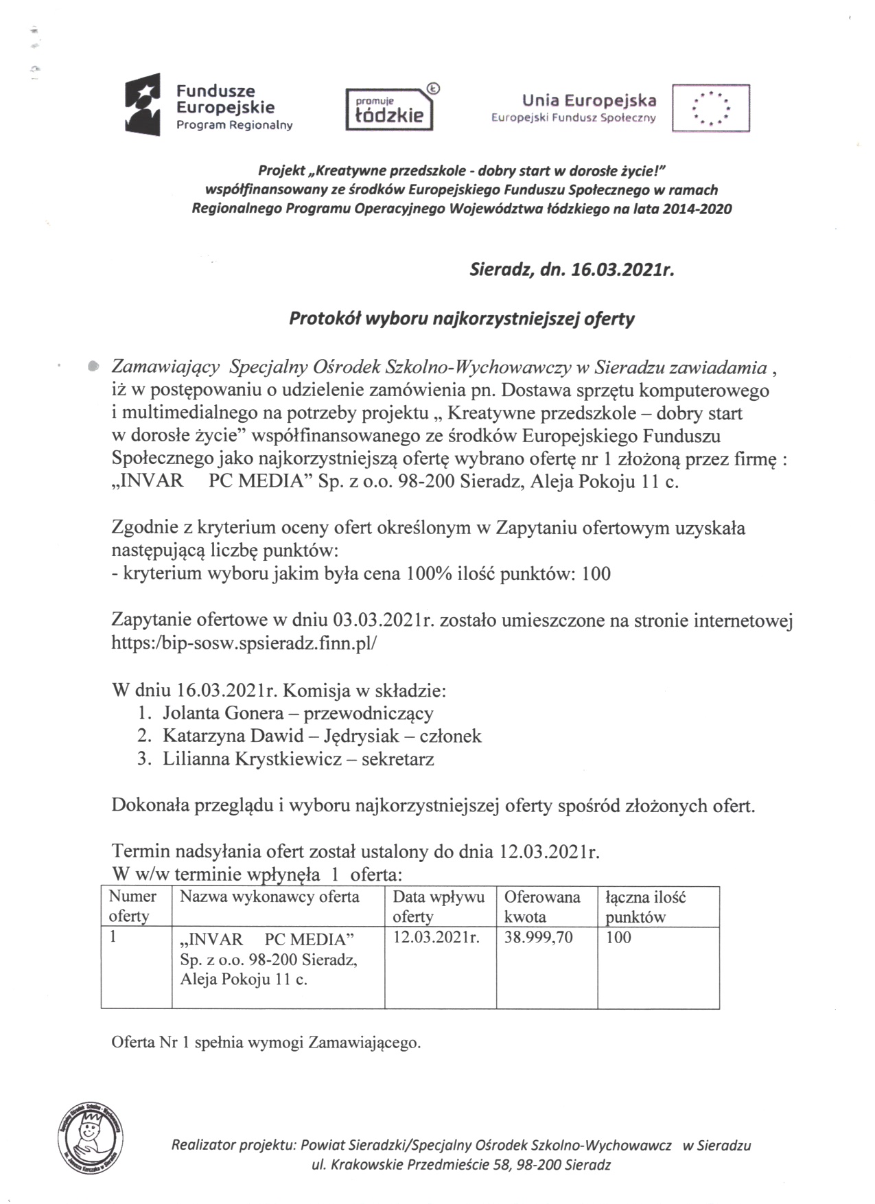 PROTOKÓŁ WYBORU NAJKORZYSTNIEJSZEJ OFERTY W ZWIĄZKU Z REALIZACJĄ PROJEKTU "KREATYWNE PRZEDSZKOLE- DOBRY START W DOROSŁE ŻYCIE"